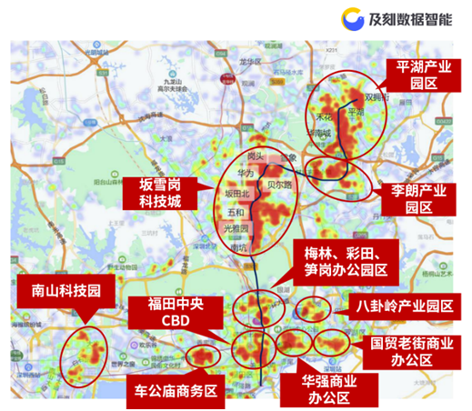 從熱力圖中可以看出,10號(hào)線乘客工作地主要集中在關(guān)外的三大片區(qū),分別是坂雪崗科技城、平湖產(chǎn)業(yè)園區(qū)、李朗產(chǎn)業(yè)園區(qū)。