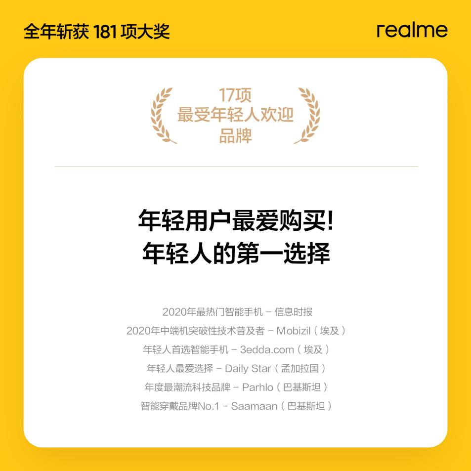自創(chuàng)立以來(lái),realme一直面向年輕用戶群體,基于對(duì)年輕人審美與偏好的精準(zhǔn)洞察與理解,不斷滿足和超越年輕科技愛(ài)好者的需求,這一策略在東南亞、南亞、歐洲、非洲等市場(chǎng)獲得極大認(rèn)可。2020年,全球給予realme“年輕人最喜愛(ài)品牌”等相關(guān)獎(jiǎng)項(xiàng)達(dá)17項(xiàng),用實(shí)力證明realme是“年輕人第一選擇”。同時(shí),realme一舉網(wǎng)羅全球各大產(chǎn)品獎(jiǎng)項(xiàng),充分證實(shí)了“好產(chǎn)品會(huì)說(shuō)話,產(chǎn)品才是硬實(shí)力”這句被商界奉為圭臬的卓見(jiàn)。