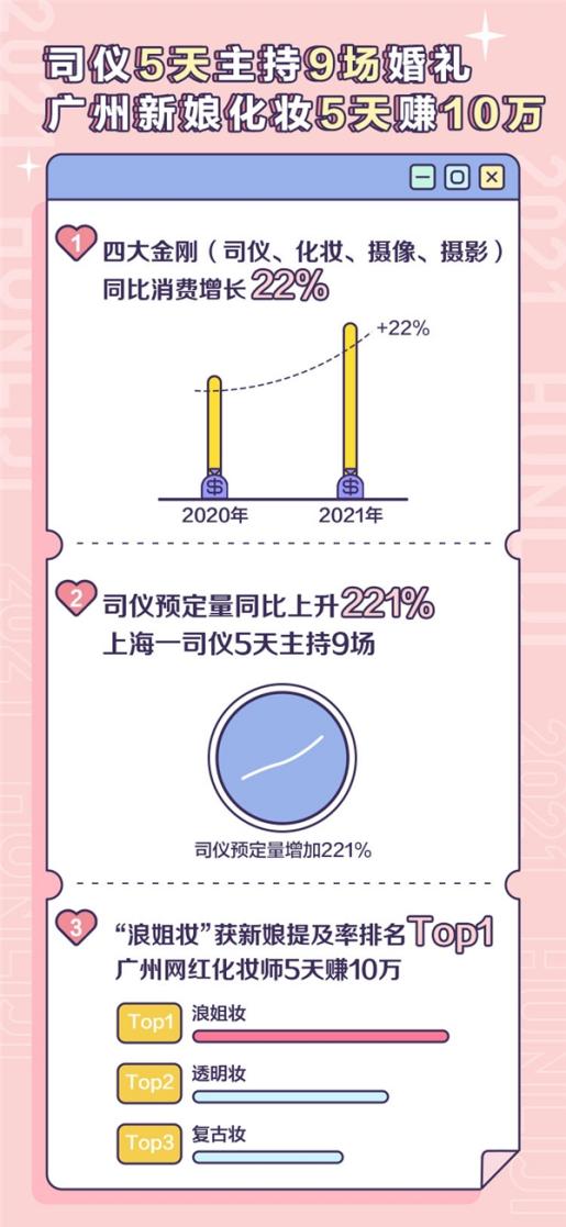 “快要忙瘋了,五一5天辦了150多場婚禮,第一天就有60場,去年這時候婚禮只有個位數(shù),今年我們員工都加班加點連夜趕工搭建場地?!被槎Y紀(jì)商家Sunny喜鋪婚禮副總趙佳佳在接受采訪的時候表示,不僅商家忙,新人也非常忙,Z世代的新人都習(xí)慣于通過線上咨詢、直播下單等互聯(lián)網(wǎng)形式進行婚禮消費,省去了線下奔波的時間。