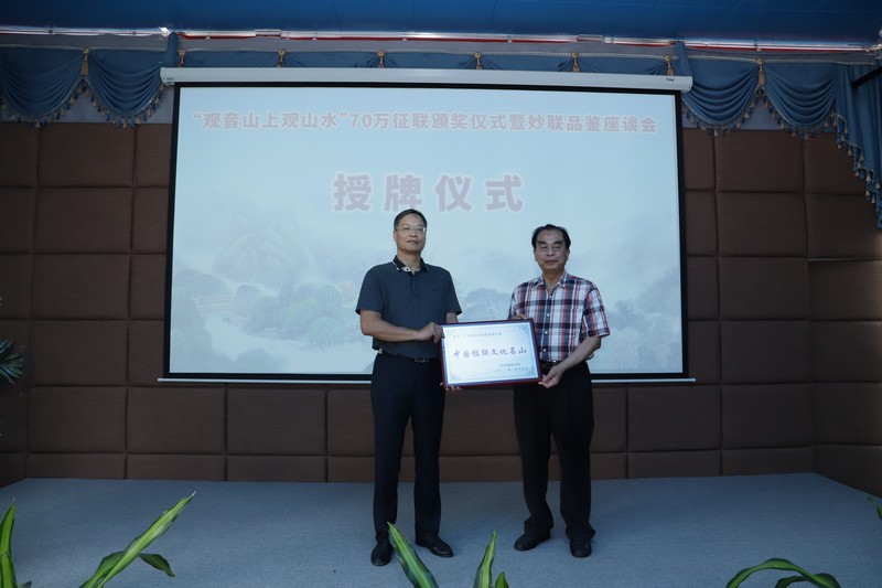 經(jīng)廣東楹聯(lián)學(xué)會(huì)研究決定,授予廣東觀音山國(guó)家森林公園“廣東省楹聯(lián)文化示范山”榮譽(yù)稱號(hào),并在活動(dòng)現(xiàn)場(chǎng)進(jìn)行授牌。中國(guó)楹聯(lián)學(xué)會(huì)會(huì)長(zhǎng)助理、廣東楹聯(lián)學(xué)會(huì)會(huì)長(zhǎng)曾建國(guó)代表廣東楹聯(lián)學(xué)會(huì),進(jìn)行授牌。