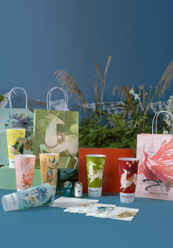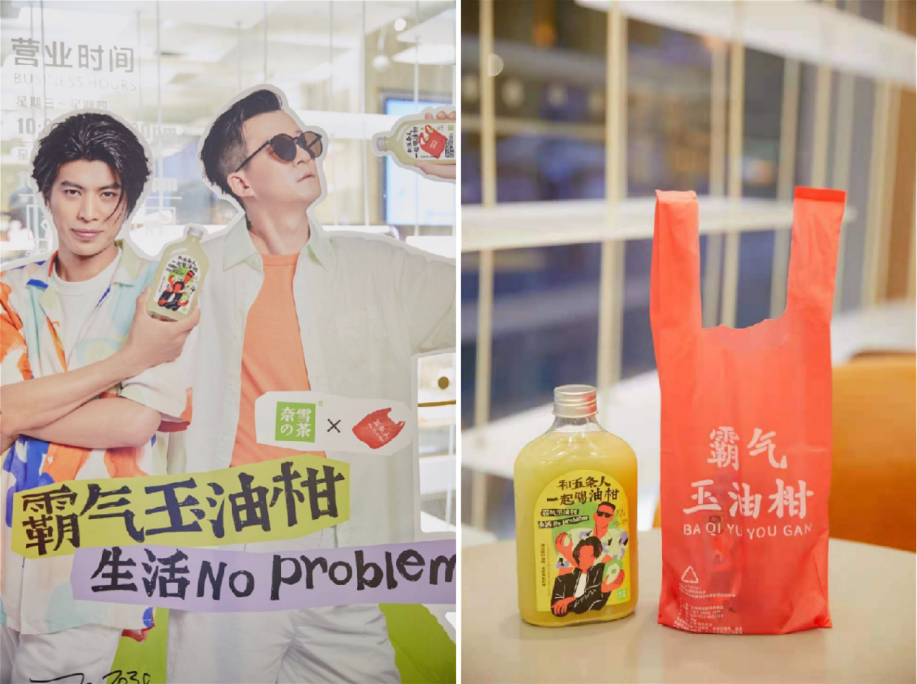 對于品牌×明星的聯(lián)名來說,調(diào)性契合是聯(lián)名活動不可或缺的"出圈基因"。而奈雪的茶霸氣玉油柑與樂隊五條人,看似來自不同次元,實則都有大膽、堅持、向上、樂觀的底色,而非將不搭嘎的兩個品牌生硬地“拉郎配”。奈雪還圍繞聯(lián)名別出心裁地推出了五條人主題的立牌、貼紙和堆頭,甚至將五條人標(biāo)志性的“紅色塑料袋”做成了極具個性且生物可降解的奈雪打包袋,可謂細(xì)節(jié)之處見真章。
