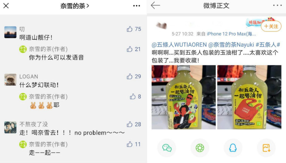 這樣“肆意妄為”的話從五條人嘴里蹦出并不稀奇,他們與生俱來的“平凡生活浪漫主義”,擅長洞察事物的另一面。精妙的是,奈雪的茶洞察到用戶在日常生活中的種種焦慮,將霸氣玉油柑“先澀后甜”的特點比作人生滋味,用這一豁達(dá)積極的態(tài)度來輕松正能量地引導(dǎo),這一點與五條人的精神內(nèi)核如出一轍。5月27日奈雪的茶X五條人TVC發(fā)布后,不少網(wǎng)友表示這波是“破次元壁”的夢幻聯(lián)動,還有網(wǎng)友在線分享五條人歌曲中有共鳴的歌詞。