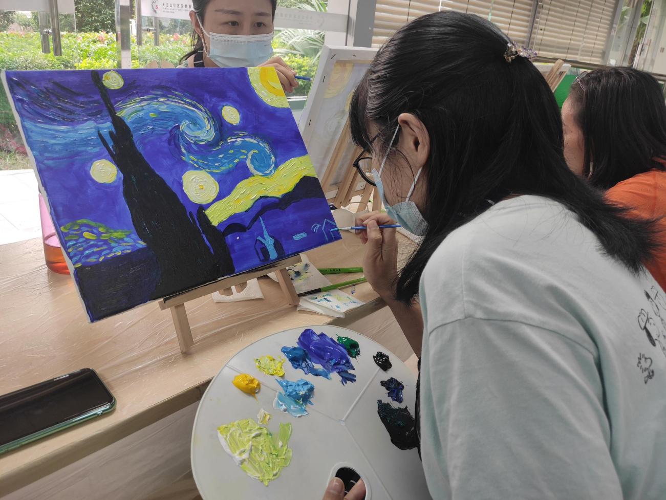 全職媽媽,這個平凡而偉大的群體,操持家務(wù)、陪伴孩子、全年無休,為此犧牲了自己的興趣愛好,交際圈、經(jīng)濟收入。大汪山社區(qū)關(guān)注媽媽身心健康,以“油畫”搭建平臺,為全職媽媽們創(chuàng)造減壓、專注、有趣的“個人時間”。在這里,媽媽們暫時放下孩子的作業(yè)、未洗的衣服、未做的晚飯,專注于和畫筆、顏料、畫友相處的時間:油畫基礎(chǔ)、畫面結(jié)構(gòu)、色彩調(diào)配、色彩層次……
