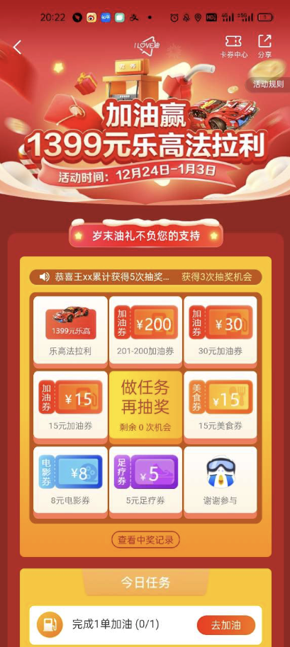 此外,“歲末油禮 ·油衷感謝”活動期間,用戶在體驗高德加油不下車服務(wù)便利的同時,還可以參加樂高玩具、201 -200免減等新年禮物的抽獎,大獎天天有。
