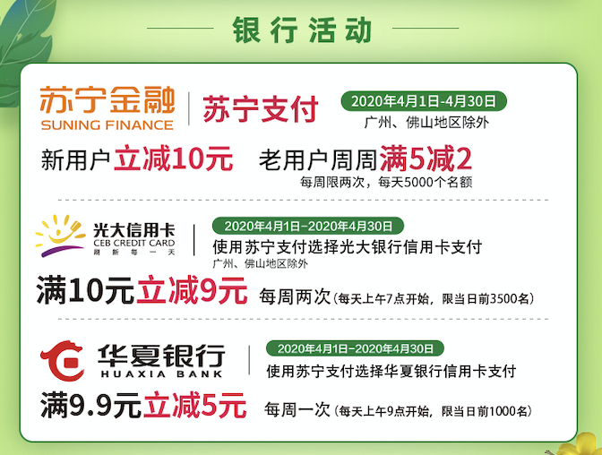 隨著蘇寧418大促開(kāi)啟,蘇寧小店福利再升級(jí),用蘇寧支付新老用戶(hù)可享支付立減,還有第二件半價(jià)、每周滿減、新人券包以及華夏、光大銀行信用卡滿減等優(yōu)惠等著你。