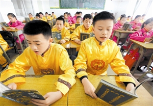 據(jù)悉,寶龍學(xué)校是寶安區(qū)第一所民辦學(xué)校,在校學(xué)生絕大多數(shù)為勞務(wù)工子女。孩子們的父母常常因忙于工作,而忽略了對他們的傳統(tǒng)道德教育?!皠倢W(xué)文化知識時不懂得基本禮儀是多數(shù)孩子的通病,很多孩子初入社會很難適應(yīng)。”該校董事長陳寶元表示,學(xué)校從上學(xué)期開始就從校外引進(jìn)國學(xué)老師,每天教授孩子們誦讀國學(xué)經(jīng)典。圖為寶龍學(xué)校的師生在課前齊誦國學(xué)經(jīng)典。