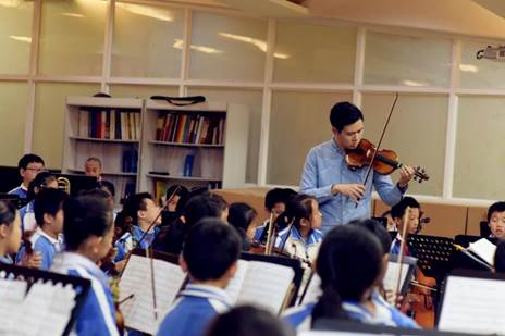 在王翔云成為丹堤實(shí)驗(yàn)學(xué)校的一員之后,就將自己投入到了弦樂團(tuán)的學(xué)生訓(xùn)練中,每天起早貪黑地和孩子們一起訓(xùn)練,甚至利用周末時(shí)間和孩子們待在一起練習(xí)。在和孩子共同努力下,丹堤實(shí)驗(yàn)學(xué)校的弦樂團(tuán)在2016年龍華新區(qū)學(xué)校藝術(shù)展演榮獲一等獎(jiǎng),在2016年廣東提琴文化藝術(shù)節(jié)青少年弦樂邀請賽中獲得銀獎(jiǎng)?!爱?dāng)然,這些成績的獲得也離不開學(xué)校的大力支持,離不開張國明教授等高人的指點(diǎn)。我認(rèn)為小學(xué)階段是人一生中形成德育和美育的重要時(shí)期。我們總會要求孩子們要形成良好的生活習(xí)慣,我認(rèn)為倒不如讓他們覺得我們現(xiàn)在做的每一件事都是正確的,有意義的,比如在我們的課堂和訓(xùn)練中,我就會要求他們將譜臺、椅子、琴盒、琴袋等擺放整齊,現(xiàn)在他們都可以自覺地完成。”