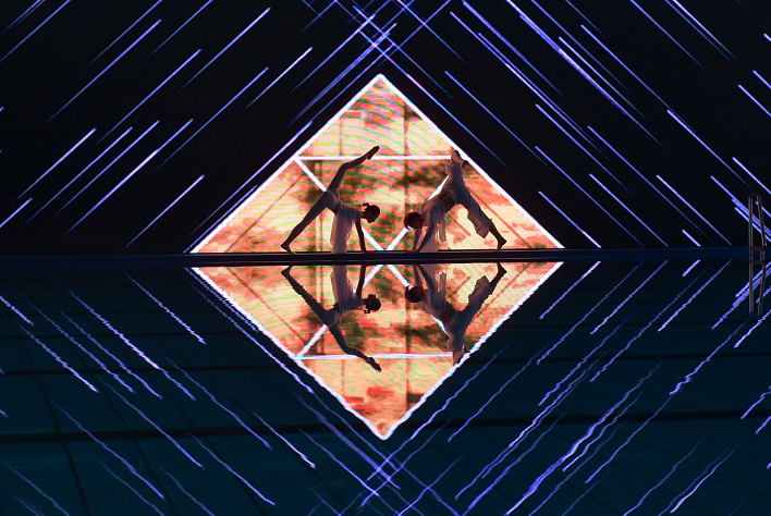 啟動(dòng)儀式在數(shù)字舞美《極魅之光》中開啟,作為首次在游泳館內(nèi)舉行的開幕式,平靜的水面倒映著變幻的光影和舞姿,精彩的表演贏得了現(xiàn)場(chǎng)觀眾的熱烈掌聲。