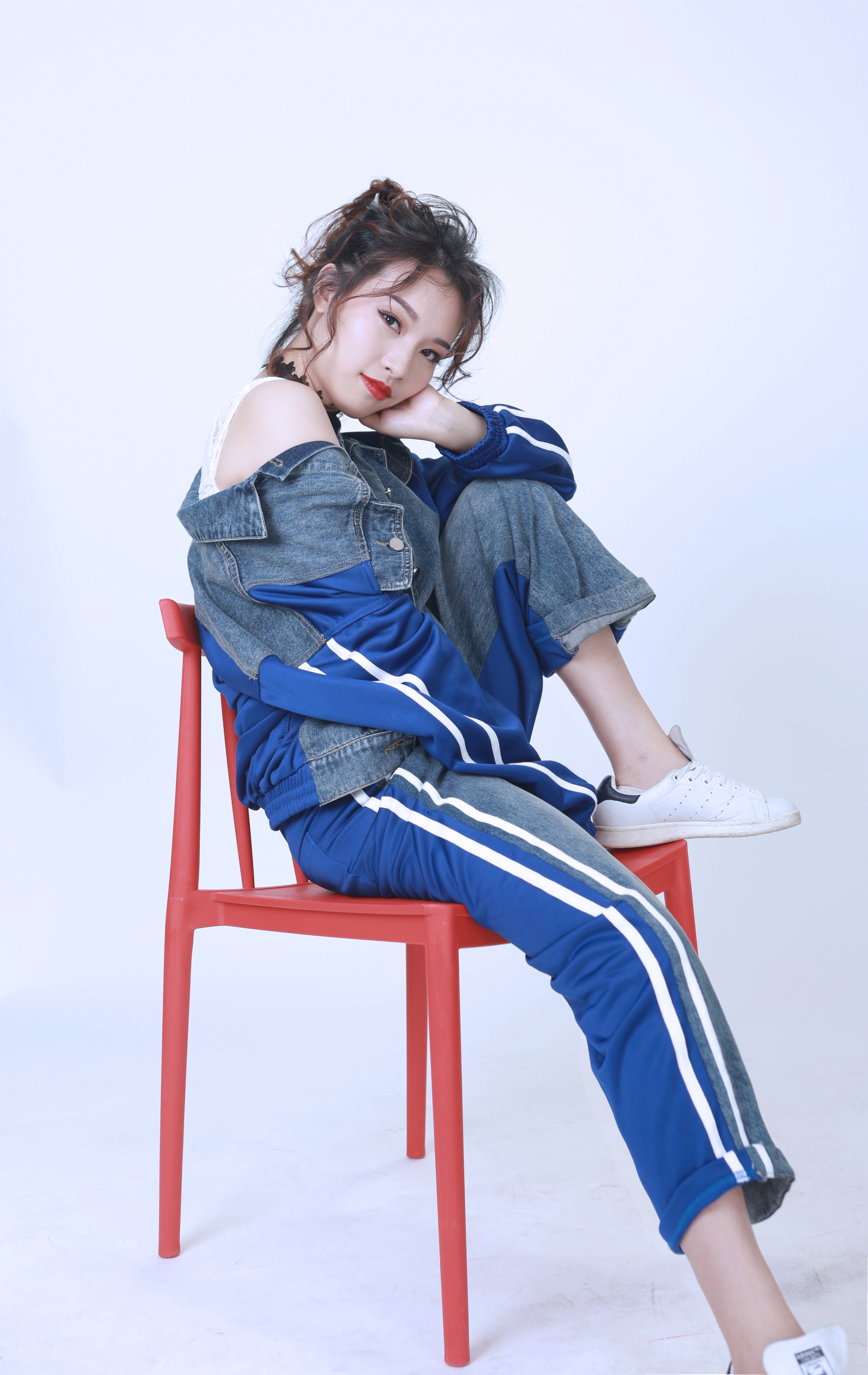 改造后的芷苑小姐姐大走街頭風(fēng),一頭卷發(fā)胡亂綁成高馬尾,搭配星星破洞oversized牛仔外套&漸變牛仔skinny,碰撞上大紅唇色,一改之前的乖巧模樣。