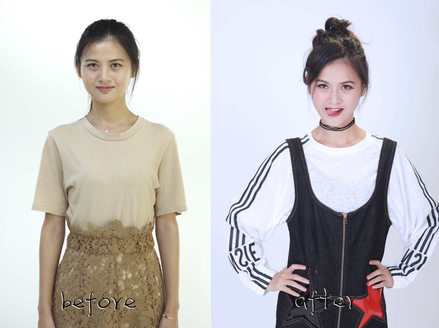 改造后的曉敏小仙女,高高的丸子頭顯得元氣滿滿,西瓜紅色系腮紅和唇色少女感滿分,搭配俏皮的背帶褲,我也好想和曉敏一起玩耍喲。