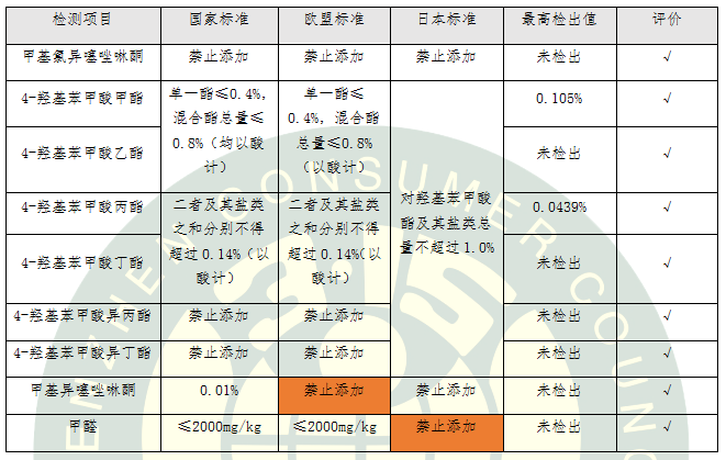 表3.不同國家地區(qū)防腐劑標準要求比對及評價結(jié)果