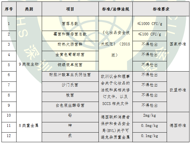 本次比較試驗檢測項目廣泛征求了企業(yè)、業(yè)內(nèi)專家和第三方檢測機構(gòu)的意見,不僅依據(jù)了現(xiàn)行國家標準,而且在國標基礎(chǔ)上結(jié)合嚴格的歐盟標準 《歐盟化妝品法規(guī)EC1223/2009及其相關(guān)修訂文件》、《歐盟消費者安全科學委員會(SCCS)關(guān)于化妝品安全的第九版指南》、德國聯(lián)邦消費者保護和食品安全局(BVL)關(guān)于可避免雜質(zhì)重金屬限值的調(diào)查報告、美國《聯(lián)邦食品、藥品和化妝品法案》、日本厚生勞動省《藥事法》以及其它相關(guān)標準、法規(guī)和技術(shù)文件的要求,采用國家標準檢測方法、實驗室通用方法等手段進行檢測,從44項指標展開氣墊粉底安全性品質(zhì)大比拼,詳細項目與要求見表1。
