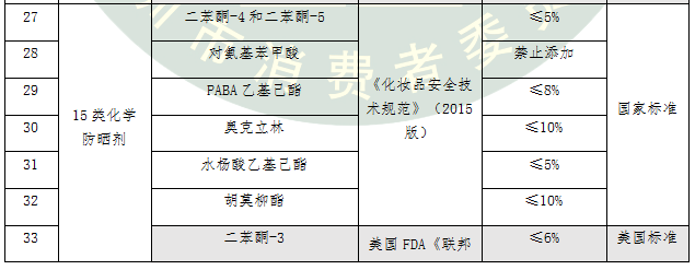 防曬化妝品在美國按非處方藥(OTC)管理,新的防曬劑當作新藥品來批準,審評要求非常嚴格。本次比較試驗測試的15類化學防曬劑按照國標、歐標和美標中最嚴格的標準進行評價。我國允許使用的5類化學防曬劑在美國被禁止使用,還有4類化學防曬劑在美國的限量要求更加嚴格。
