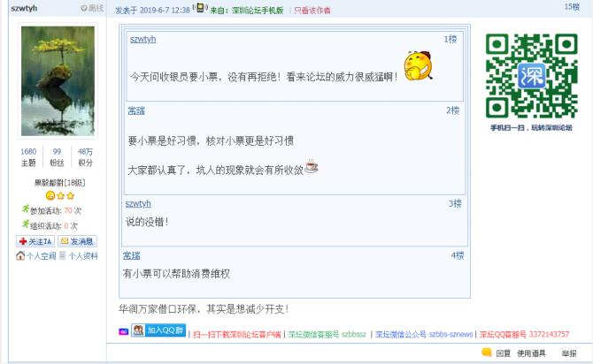 記者從問政平臺(tái)得知,5月底以來,還有市民發(fā)帖反映,除華潤(rùn)萬家外,科技園萬象天地華潤(rùn)Ole、僑香路沃爾瑪?shù)瘸幸泊嬖诓惶峁┘堎|(zhì)購(gòu)物小票的情況。目前,市民仍然普遍認(rèn)同超市應(yīng)主動(dòng)提供紙質(zhì)購(gòu)物小票,避免顧客被價(jià)格欺詐。有市民表示:“遇到最多的是優(yōu)惠打折,實(shí)際還是原價(jià)買單,這時(shí),手中有小票一目了然,不花冤枉錢?!边€有市民質(zhì)疑,“奸商,動(dòng)不動(dòng)就打著環(huán)保這些高大上的理由作借口”。同時(shí),也有市民體驗(yàn)過微信小票后表示,“沃爾瑪手機(jī)掃碼付款是沒有紙票,購(gòu)物小票藏在微信公眾號(hào)里,退換貨就在那里面進(jìn)行。這就是科技發(fā)達(dá)帶來的豐碩成果,挺好的?!苯刂劣浾甙l(fā)稿時(shí),市民關(guān)于科技園萬象天地華潤(rùn)Ole、僑香路沃爾瑪?shù)瘸胁惶峁┵?gòu)物小票的帖文還沒有得到相關(guān)部門回應(yīng)。