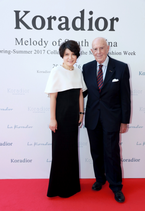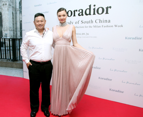 現任贏家時尚控股有限公司董事局主席金明先生和米蘭達可兒在2017年米蘭時裝周Koradior發(fā)布秀背景板合影