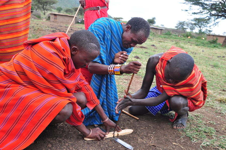 馬賽人盛行一夫多妻制。成年男子蓄發(fā)編成小辮,年輕婦女剃光頭。近年來,定居的馬賽兒童開始上學(xué),已出現(xiàn)少數(shù)馬賽人知識(shí)分子。圖為為游客表演鉆木取火等節(jié)目的馬賽人。李仁奇 攝