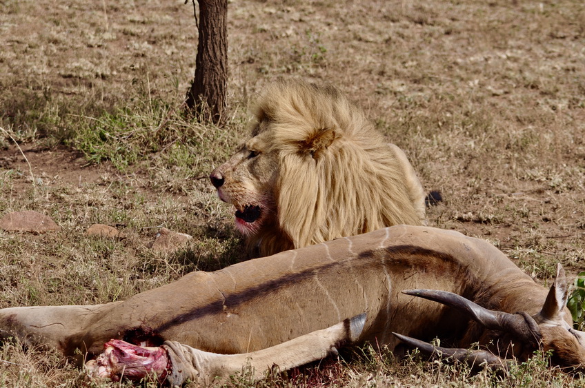 作者運(yùn)氣不錯,在塞倫蓋蒂巡游時(shí)巧遇一頭雄獅守護(hù)在一頭被咬死的大羚羊旁。李仁奇 攝