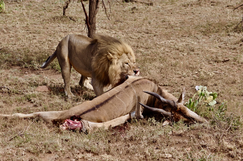 這頭估計(jì)重達(dá)二、三百斤的大羚羊是早晨被三頭雌獅捕獲的,雄獅趕到后,雌獅們各自撕扯一塊肉到遠(yuǎn)處享用去了。雄獅腹中饑餓,不顧乘坐兩臺越野車的十位游客近在咫尺,只管用力撕咬拖拽羚羊尸體。李仁奇 攝
