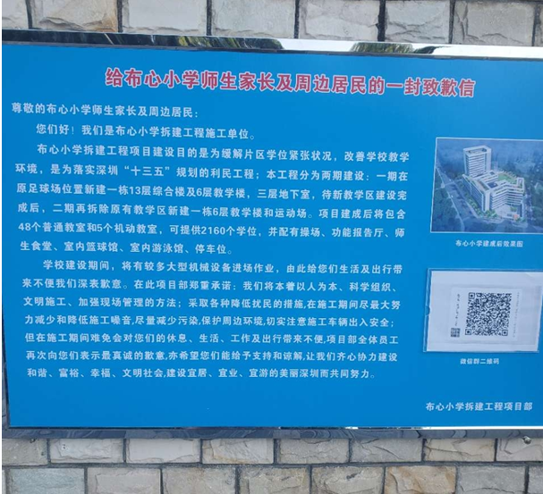 11月9日,有市民在深圳論壇發(fā)帖反映稱,“小孩如今就讀布心小學??砷_學一個月后,就看到校內(nèi)有公示說學校將會原地重建?!痹摷议L對學生的安全情況表示擔憂:“這幾年因地下結(jié)構(gòu)受影響而導致路面坍塌的情況時有發(fā)生,現(xiàn)如今要在與教室目測距離不超過五米的地方建兩座分別為13層和6層的建筑,這樣大的工程量如果不分流,施工風險可想而知。即使重建采用高新技術(shù),能夠保證教室的安全,但學生又如何能在學校與工地的混合期里度過至少四年以上的工期?粉塵和噪音對學生的影響也很大也可想而知。”