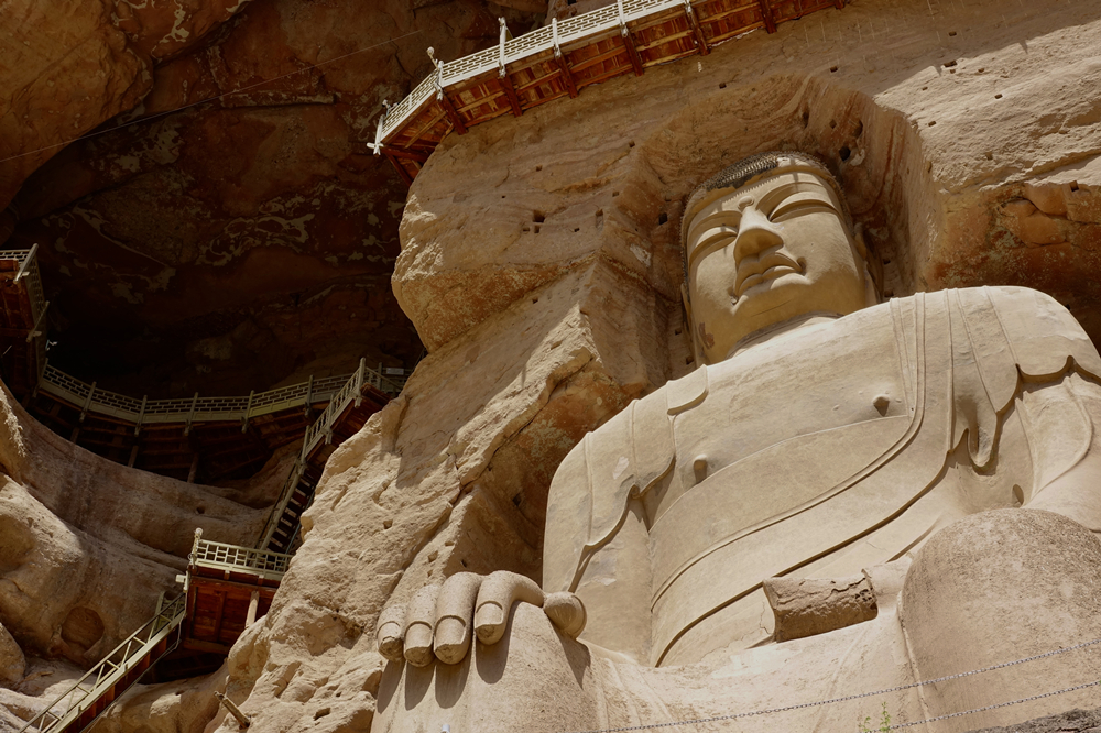 佛像左上方為169窟,169窟為一天然大洞穴,是現(xiàn)存最重要石窟,窟內(nèi)存西秦時(shí)的造像和壁畫。李仁奇 攝