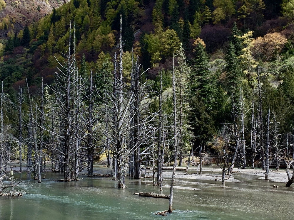 枯樹(shù)灘,因地質(zhì)災(zāi)害導(dǎo)致河流改道,淹沒(méi)大片原始樹(shù)木,雜木鈣化后留下一片樹(shù)樁置于河灘,故稱“枯樹(shù)灘”。李仁奇 攝