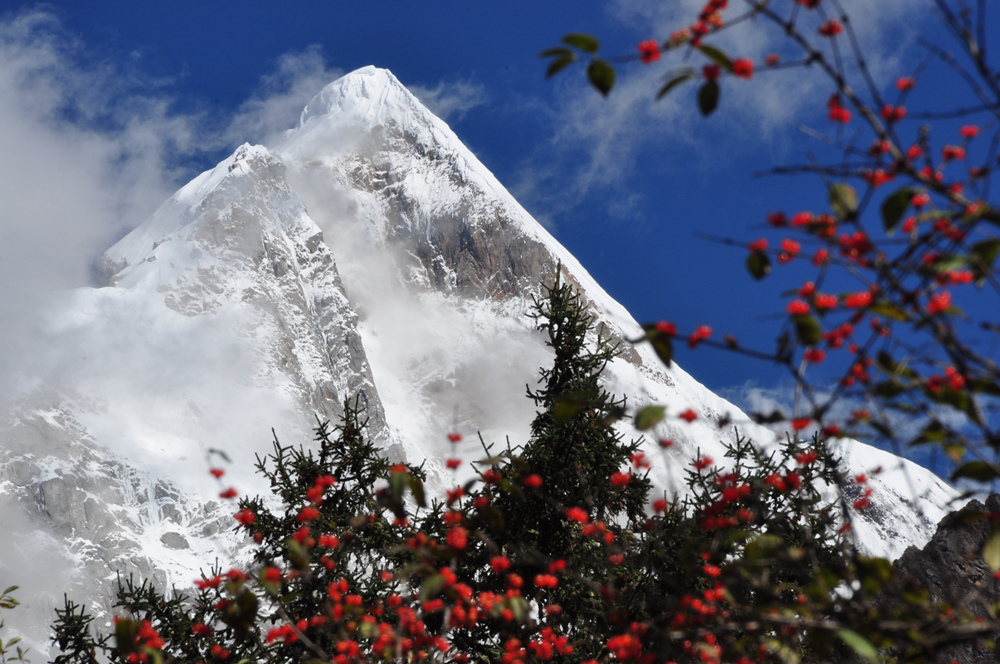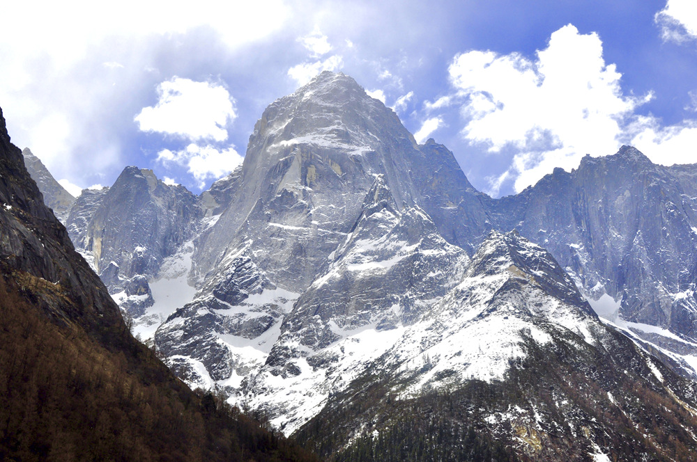 四座山峰長(zhǎng)年冰雪覆蓋,因幺妹身材最為苗條,經(jīng)常云遮霧繞,最難窺得全貌,素有“蜀山之后”、“東方的阿爾卑斯”之稱,與“蜀山之王”貢嘎山遙遙相望。李仁奇 攝