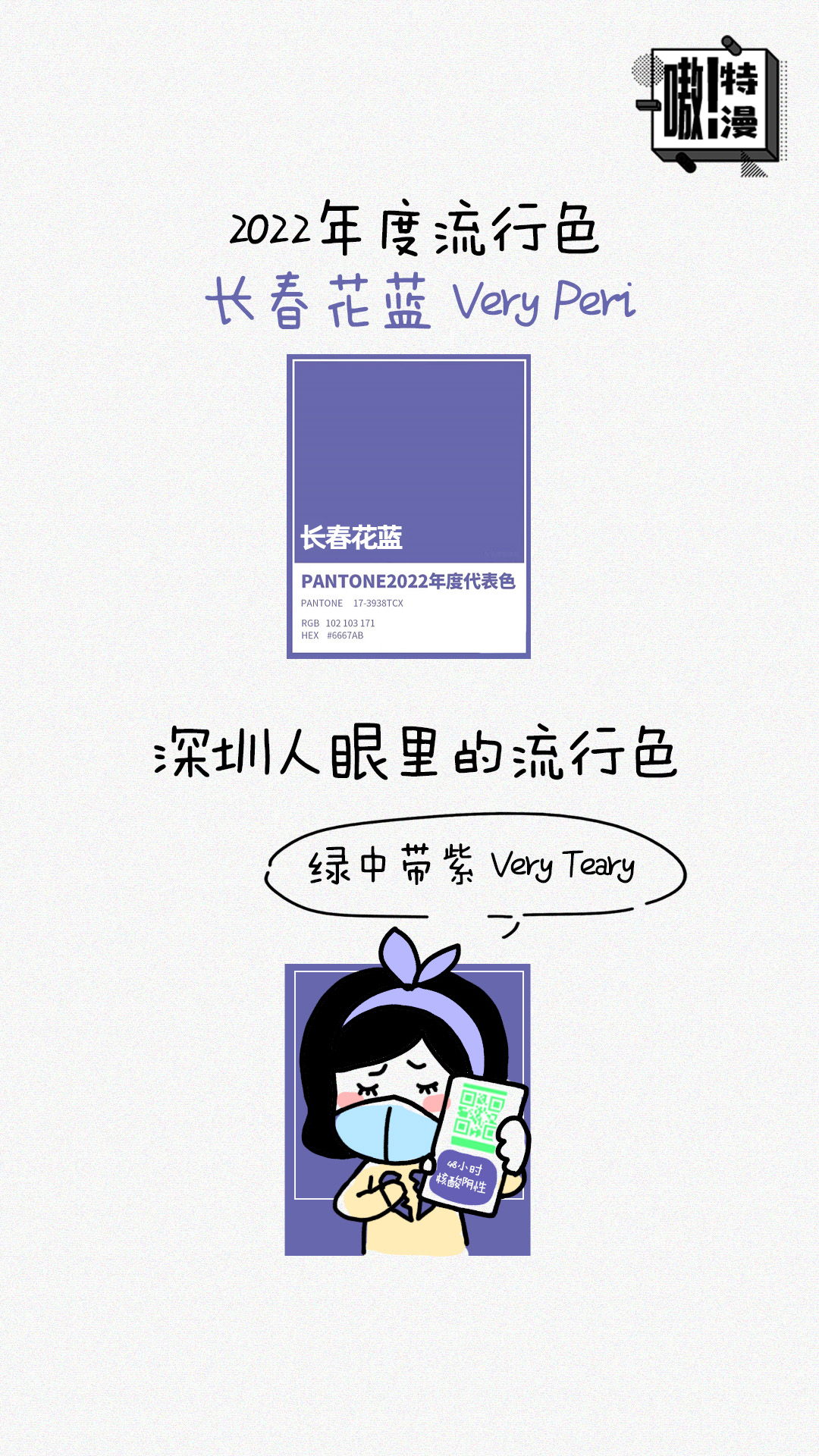 #嗷!特漫# 【#深圳人眼里的流行色是綠中帶紫# 】潘通(一家專門開發(fā)和研究色彩的權(quán)威機(jī)構(gòu))發(fā)布的2022年度流行色是名為very peri的長(zhǎng)春花藍(lán)。而深圳人眼里的流行色則是綠中帶紫 Very Teary
