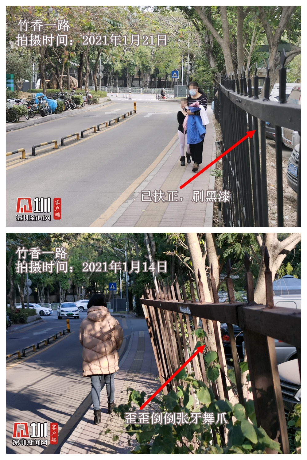 記者在竹香一路看到,原本向外傾斜的圍欄已經(jīng)全部扶正加固,且重新噴上黑色新漆,看起來整齊了許多,通行體驗(yàn)較之前更好?!艾F(xiàn)在弄得不錯(cuò),比之前牢固很多,向外的尖尖也都弄整齊了”家住附近的王先生說。