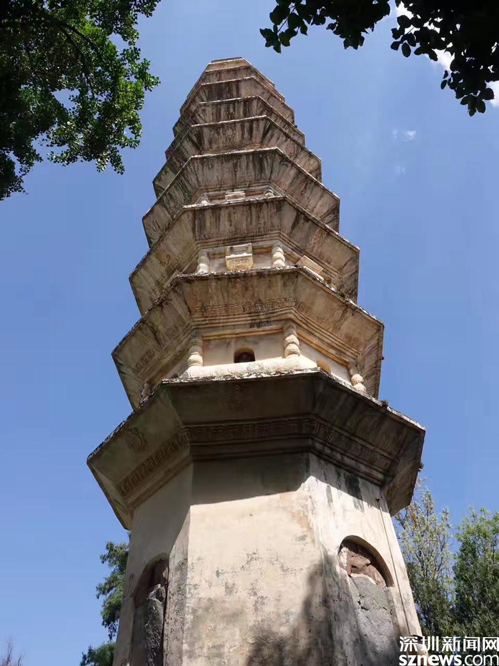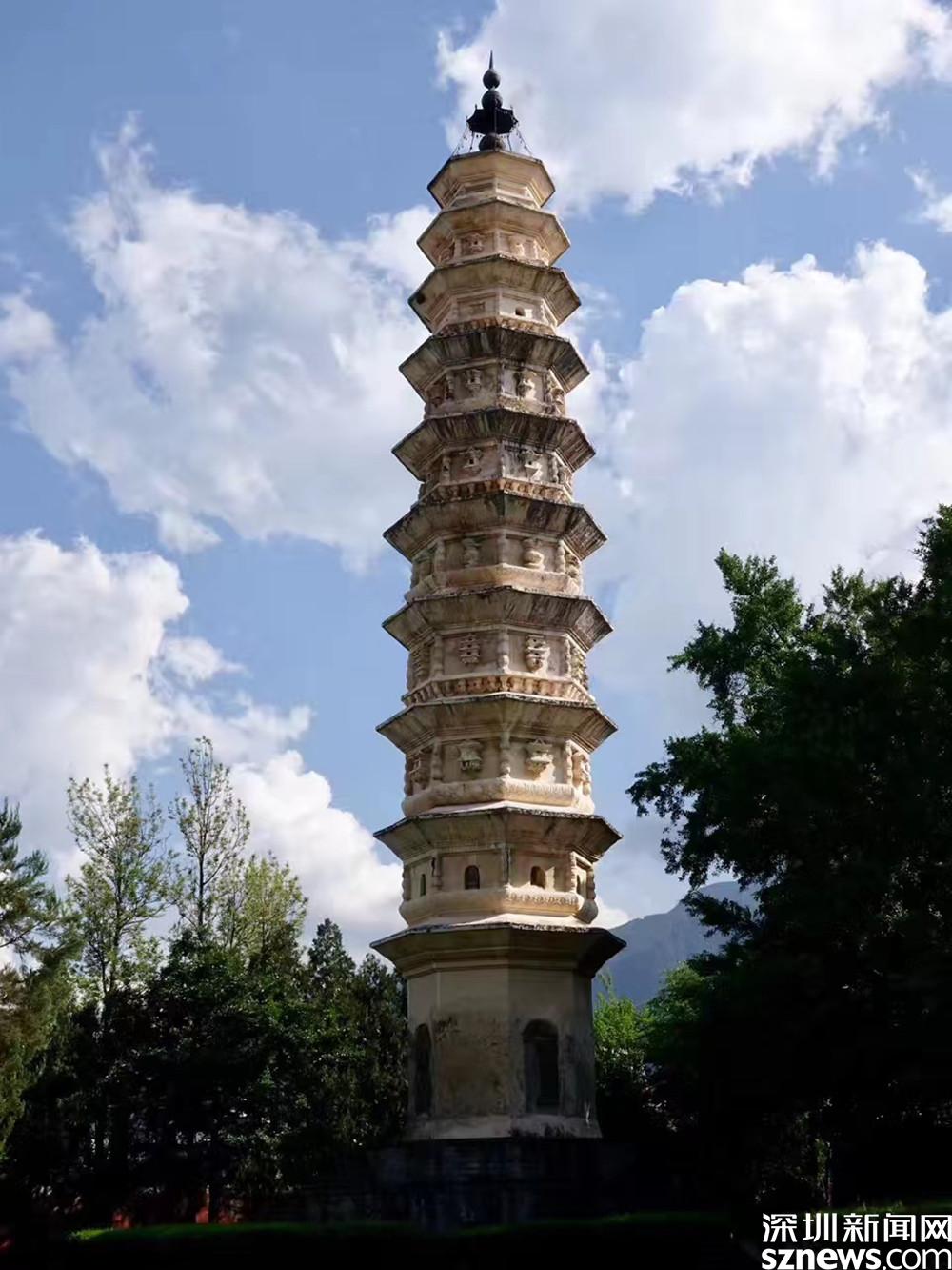 大塔名千尋塔,通高69.13米,底方9.9米,凡16級。南北小塔均為十級,高42.17米,為八角形密檐式空心磚塔。李仁奇 攝