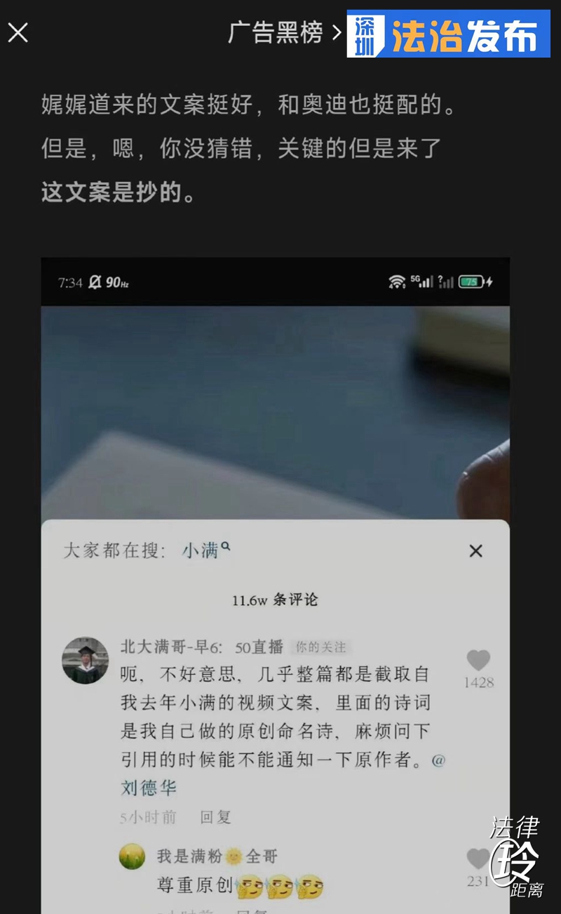 讀特客戶端·深圳新聞網(wǎng)2022年5月24日訊(記者 張玲 翁任瑩 實(shí)習(xí)生 趙薇)5月21日是中國24節(jié)氣的小滿,奧迪公司一則小滿廣告迅速成為刷屏爆款。在這條名為《今日小滿,人生小滿就好》的廣告短片中,出鏡代言人是劉德華,他用娓娓道來的口吻說著“小滿代表了一種人生態(tài)度……”然而,不到1天的時(shí)間,奧迪小滿廣告就深陷文案抄襲風(fēng)波,博主“北大滿哥”指出這部短片幾乎全文抄了自己去年發(fā)布的小滿視頻文案。