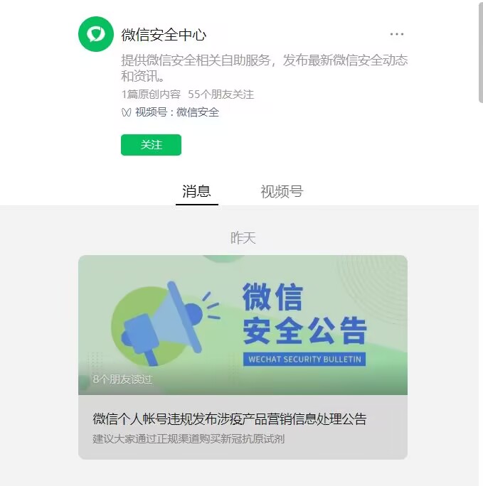 公告強調,“利用微信個人帳號發(fā)布抗原檢測試劑、藥品等營銷信息的行為,違反了相關法律法規(guī),也違反了《微信個人帳號使用規(guī)范》,微信安全團隊將對違法違規(guī)行為進行堅決處理、嚴厲打擊?!?br/>