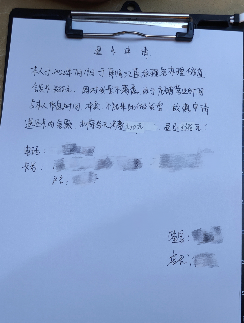 本人于2022年7月19日在該商家處花費(fèi)3888元充值會(huì)員卡,后因?qū)Πl(fā)型不滿意及店鋪營(yíng)業(yè)時(shí)間與本人作息時(shí)間沖突,故申請(qǐng)退還卡內(nèi)余額。商家于2023年4月25日同意在5個(gè)工作日內(nèi)退款,但一直拖延,至今仍未退款。