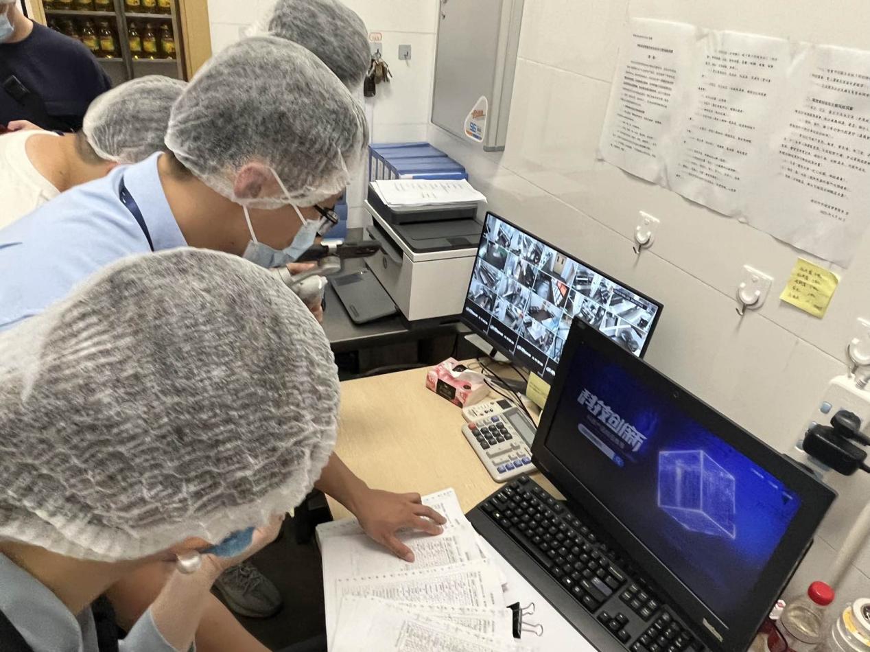 隨后,執(zhí)法人員一行進(jìn)入食堂后廚,對面點(diǎn)間、儲藏間、清洗區(qū)、冷凍庫等各分區(qū)進(jìn)行執(zhí)法檢查。經(jīng)查,后廚整體布局合理,其中食材存儲符合規(guī)定且日期均在保質(zhì)期內(nèi);留樣冰箱內(nèi)按規(guī)定保存了近期餐食樣品,留樣品名及時(shí)間標(biāo)注清晰,確保了來源可追溯;清洗區(qū)分區(qū)明確,刀具砧板按照顏色管理,有效避免了交叉感染。此外,在后廚辦公室,執(zhí)法人員查看了索證索票落實(shí)情況及日管控、周排查、月調(diào)度等相關(guān)制度管理資料,各類信息管理較完善。
