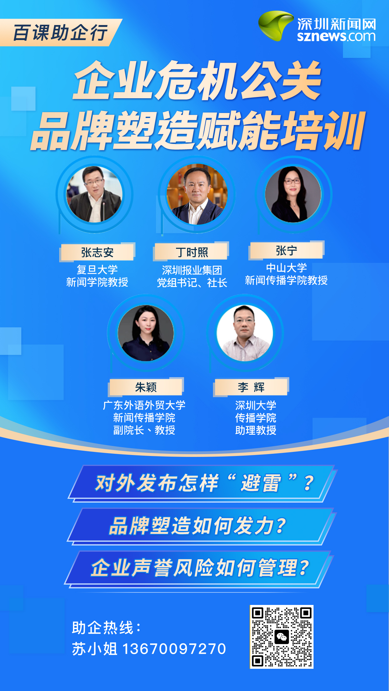 深圳新聞網(wǎng)以長期輿論研究及智庫服務經(jīng)驗為支撐,不斷充實師資庫、豐富課程體系。目前,智庫團隊包括復旦大學新聞學院教授張志安,深圳報業(yè)集團黨組書記、社長丁時照,中國青年報編委曹林,中山大學新聞傳播學院教授張寧,廣東外語外貿(mào)大學新聞傳播學院副院長、教授朱穎,深圳大學傳播學院助理教授李輝等近百位來自公共關系、新聞傳播領域?qū)<摇?/p>