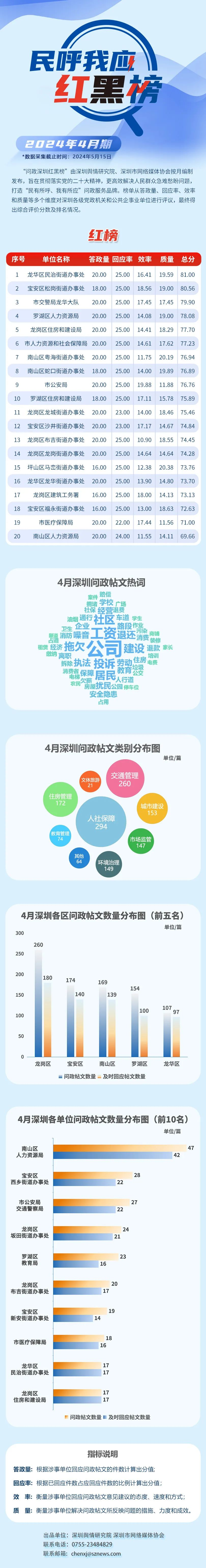 “深圳民呼我應(yīng)紅黑榜”由深圳輿情研究院、深圳市網(wǎng)絡(luò)媒體協(xié)會按月編制發(fā)布,旨在貫徹落實黨的二十大精神,更高效解決人民群眾急難愁盼問題,打造“民有所呼、我有所應(yīng)”問政服務(wù)品牌。榜單從答政量、回應(yīng)率、效率和質(zhì)量等多個維度對深圳各級黨政機關(guān)和公共企事業(yè)單位進行評議,最終得出綜合評價分數(shù)及排名情況。