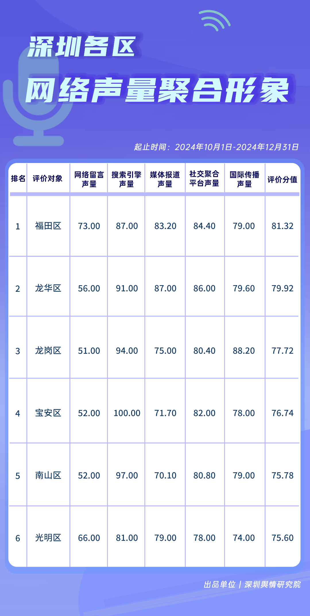 10-12月,福田區(qū)、龍崗區(qū)、光明區(qū)、龍華區(qū)、南山區(qū)、寶安區(qū)登上榜單前六。榜單中,福田區(qū)、龍崗區(qū)、光明區(qū)位列前三,綜合評價分值均在80分以上,居于榜單第四至第六名的龍華區(qū)、南山區(qū)、寶安區(qū)也在積極塑造網(wǎng)絡(luò)形象的道路上不斷邁進,展現(xiàn)了各區(qū)在網(wǎng)絡(luò)形象建設(shè)領(lǐng)域的蓬勃活力與持續(xù)努力。
