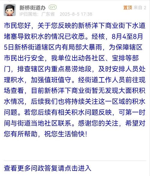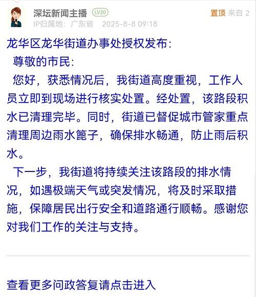 您好,獲悉情況后,我街道高度重視,工作人員立即到現(xiàn)場進(jìn)行核實(shí)處置。經(jīng)處置,該路段積水已清理完畢。同時,街道已督促城市管家重點(diǎn)清理周邊雨水篦子,確保排水暢通,防止雨后積水。