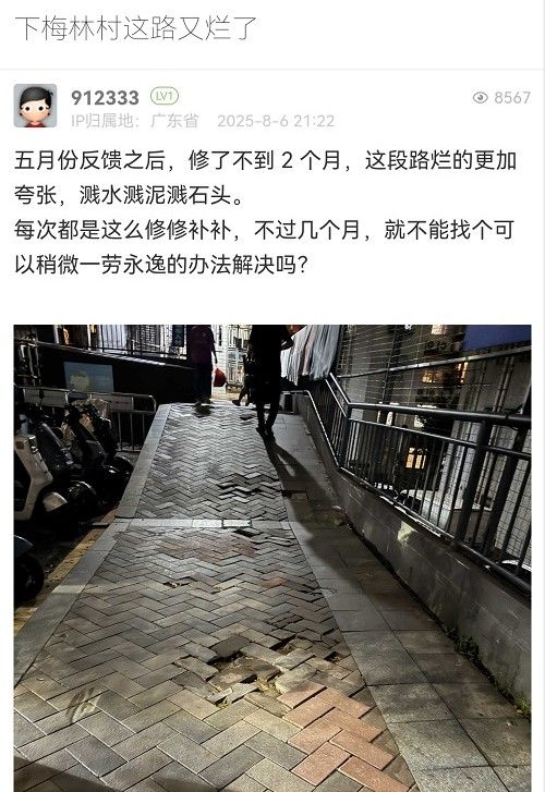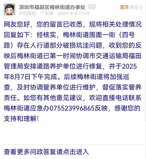 網(wǎng)友您好,您的留言已收悉,現(xiàn)將相關(guān)處理情況回復(fù)如下:經(jīng)核實(shí),梅林街道圍面一街(四號路)存在人行道部分破損坑洼問題,收到您的反映后梅林街道已第一時間協(xié)調(diào)市交通運(yùn)輸局福田管理局安排道路養(yǎng)護(hù)單位進(jìn)行修復(fù),并于2025年8月7日下午完成。后續(xù)梅林街道將加強(qiáng)巡查,及時協(xié)調(diào)管養(yǎng)單位進(jìn)行維護(hù),督促落實(shí)管養(yǎng)責(zé)任。如您有其他意見建議,歡迎直接電話聯(lián)系梅林街道應(yīng)急辦075523996865反映,感謝您的支持和理解!