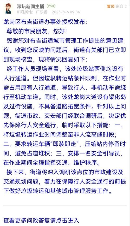 經(jīng)工作人員現(xiàn)場查看,該處垃圾站兩側(cè)均設(shè)有人行通道。但因垃圾轉(zhuǎn)運(yùn)站條件限制,在作業(yè)時需占用原有人行通道,導(dǎo)致行人、非機(jī)動車需繞行至機(jī)動車道。同時,該處龍崗大道設(shè)有渠化島及過街設(shè)施,不具備道路拓寬條件。針對以上問題,街道市政、交安部門經(jīng)聯(lián)合調(diào)研后,決定優(yōu)先保障行人安全通行,臨時采取以下措施:一、將垃圾轉(zhuǎn)運(yùn)作業(yè)時間調(diào)整至非人流高峰時段;二、要求轉(zhuǎn)運(yùn)車輛“即裝即走”,壓縮站內(nèi)停留時間,避免占道堆積;三、安排一名安全引導(dǎo)員,在作業(yè)期間全程指揮交通、維護(hù)秩序。