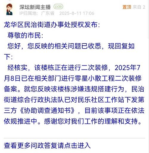 經(jīng)核實(shí),該樓棟正在進(jìn)行二次裝修,2025年7月8日已在相關(guān)部門進(jìn)行零星小散工程二次裝修備案。就您反映該樓棟涉嫌違規(guī)搭建行為,民治街道綜合行政執(zhí)法隊(duì)已對民樂社區(qū)工作站下發(fā)第三方《協(xié)助調(diào)查通知書》,目前該事項(xiàng)正在依法依規(guī)推進(jìn)中。感謝您對我們工作的理解和支持。