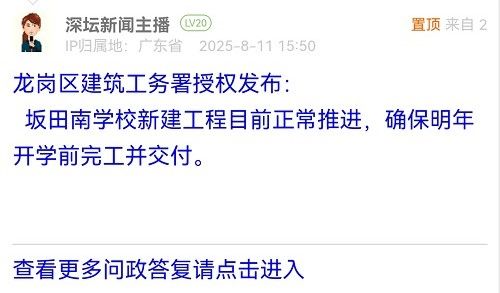 23. 帖文《龍崗區(qū)坂田南學(xué)校施工進(jìn)度怎樣了?26年9月能招生嗎?》