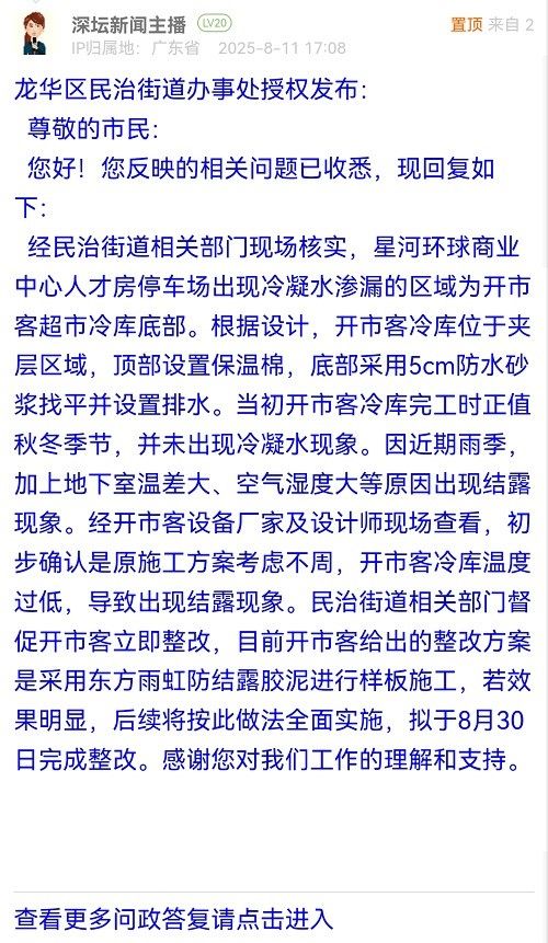 經(jīng)民治街道相關(guān)部門現(xiàn)場核實(shí),星河環(huán)球商業(yè)中心人才房停車場出現(xiàn)冷凝水滲漏的區(qū)域?yàn)殚_市客超市冷庫底部。根據(jù)設(shè)計(jì),開市客冷庫位于夾層區(qū)域,頂部設(shè)置保溫棉,底部采用5cm防水砂漿找平并設(shè)置排水。當(dāng)初開市客冷庫完工時正值秋冬季節(jié),并未出現(xiàn)冷凝水現(xiàn)象。因近期雨季,加上地下室溫差大、空氣濕度大等原因出現(xiàn)結(jié)露現(xiàn)象。經(jīng)開市客設(shè)備廠家及設(shè)計(jì)師現(xiàn)場查看,初步確認(rèn)是原施工方案考慮不周,開市客冷庫溫度過低,導(dǎo)致出現(xiàn)結(jié)露現(xiàn)象。民治街道相關(guān)部門督促開市客立即整改,目前開市客給出的整改方案是采用東方雨虹防結(jié)露膠泥進(jìn)行樣板施工,若效果明顯,后續(xù)將按此做法全面實(shí)施,擬于8月30日完成整改。感謝您對我們工作的理解和支持。