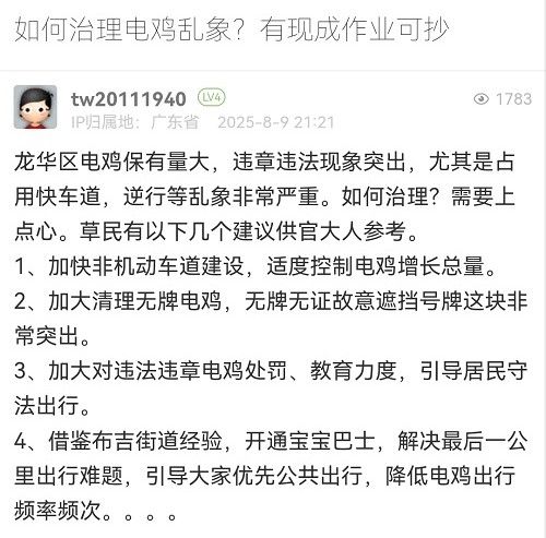感謝您的反饋。龍華區(qū)作為深圳市的中軸新城,產(chǎn)業(yè)密集、人口居住集中,轄區(qū)電動自行車保有量同樣呈快速增長狀態(tài),目前龍華區(qū)的非機(jī)動車占全市總量約五分之一。一直以來,深圳市公安局交通管理局龍華大隊(duì)高度重視電動自行車安全管理工作,從通行管理、秩序整治、隱患治理、宣傳教育四大方面綜合施策,不斷優(yōu)化治理策略,切實(shí)提升電動自行車交通管理水平。您的建議我們也會向相關(guān)部門反饋,共同努力治理電動車。再次感謝您對交通管理工作的支持和理解!