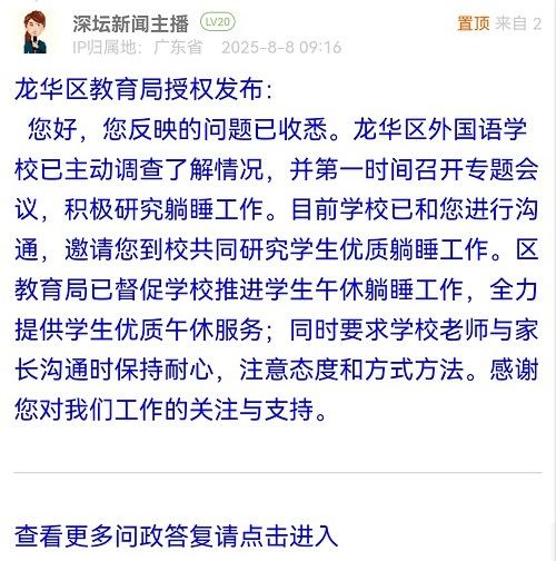 您好,您反映的問題已收悉。龍華區(qū)外國語學(xué)校已主動調(diào)查了解情況,并第一時間召開專題會議,積極研究躺睡工作。目前學(xué)校已和您進(jìn)行溝通,邀請您到校共同研究學(xué)生優(yōu)質(zhì)躺睡工作。區(qū)教育局已督促學(xué)校推進(jìn)學(xué)生午休躺睡工作,全力提供學(xué)生優(yōu)質(zhì)午休服務(wù);同時要求學(xué)校老師與家長溝通時保持耐心,注意態(tài)度和方式方法。感謝您對我們工作的關(guān)注與支持。