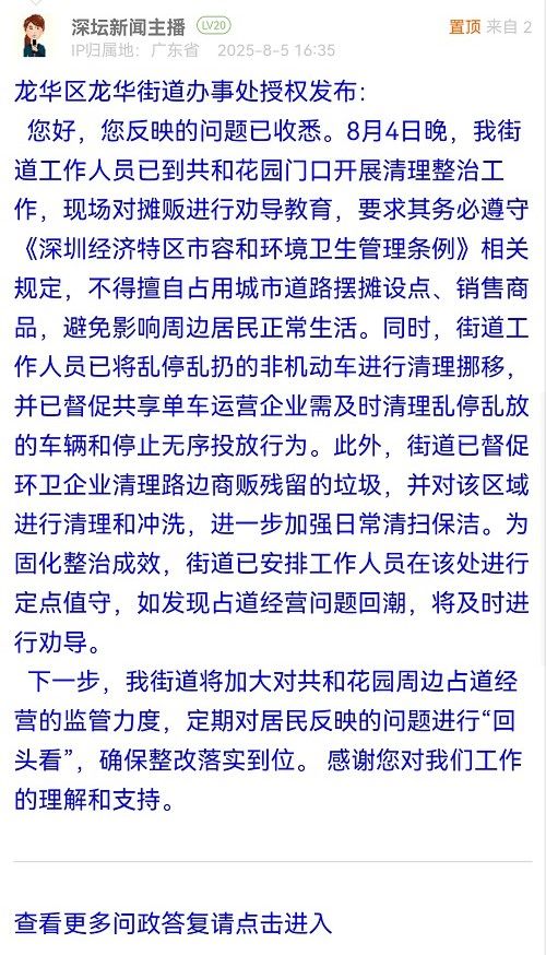 您好,您反映的問題已收悉。8月4日晚,我街道工作人員已到共和花園門口開展清理整治工作,現(xiàn)場對攤販進(jìn)行勸導(dǎo)教育,要求其務(wù)必遵守《深圳經(jīng)濟(jì)特區(qū)市容和環(huán)境衛(wèi)生管理?xiàng)l例》相關(guān)規(guī)定,不得擅自占用城市道路擺攤設(shè)點(diǎn)、銷售商品,避免影響周邊居民正常生活。同時,街道工作人員已將亂停亂扔的非機(jī)動車進(jìn)行清理挪移,并已督促共享單車運(yùn)營企業(yè)需及時清理亂停亂放的車輛和停止無序投放行為。此外,街道已督促環(huán)衛(wèi)企業(yè)清理路邊商販殘留的垃圾,并對該區(qū)域進(jìn)行清理和沖洗,進(jìn)一步加強(qiáng)日常清掃保潔。為固化整治成效,街道已安排工作人員在該處進(jìn)行定點(diǎn)值守,如發(fā)現(xiàn)占道經(jīng)營問題回潮,將及時進(jìn)行勸導(dǎo)。