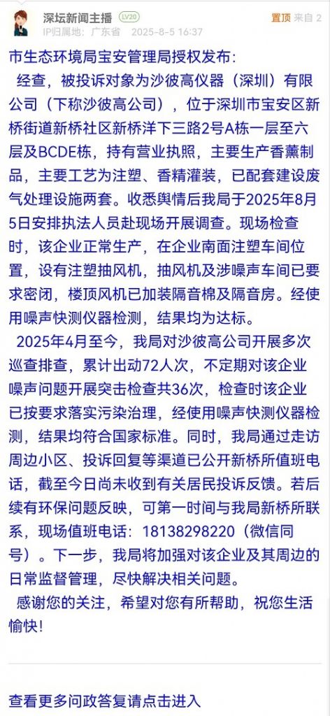 經(jīng)查,被投訴對象為沙彼高儀器(深圳)有限公司(下稱沙彼高公司),位于深圳市寶安區(qū)新橋街道新橋社區(qū)新橋洋下三路2號A棟一層至六層及BCDE棟,持有營業(yè)執(zhí)照,主要生產(chǎn)香薰制品,主要工藝為注塑、香精灌裝,已配套建設(shè)廢氣處理設(shè)施兩套。收悉輿情后我局于2025年8月5日安排執(zhí)法人員赴現(xiàn)場開展調(diào)查?,F(xiàn)場檢查時,該企業(yè)正常生產(chǎn),在企業(yè)南面注塑車間位置,設(shè)有注塑抽風(fēng)機(jī),抽風(fēng)機(jī)及涉噪聲車間已要求密閉,樓頂風(fēng)機(jī)已加裝隔音棉及隔音房。經(jīng)使用噪聲快測儀器檢測,結(jié)果均為達(dá)標(biāo)。