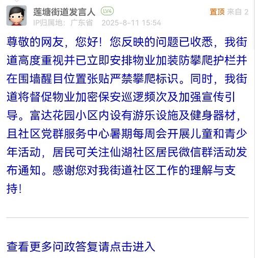 尊敬的網(wǎng)友,您好!您反映的問題已收悉,我街道高度重視并已立即安排物業(yè)加裝防攀爬護(hù)欄并在圍墻醒目位置張貼嚴(yán)禁攀爬標(biāo)識。同時,我街道將督促物業(yè)加密保安巡邏頻次及加強(qiáng)宣傳引導(dǎo)。富達(dá)花園小區(qū)內(nèi)設(shè)有游樂設(shè)施及健身器材,且社區(qū)黨群服務(wù)中心暑期每周會開展兒童和青少年活動,居民可關(guān)注仙湖社區(qū)居民微信群活動發(fā)布通知。感謝您對我街道社區(qū)工作的理解與支持!