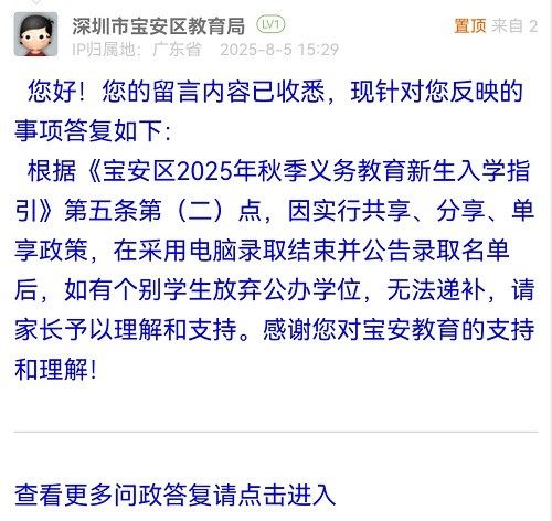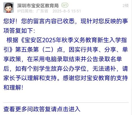 根據(jù)《寶安區(qū)2025年秋季義務(wù)教育新生入學(xué)指引》第五條第(二)點(diǎn),因?qū)嵭泄蚕怼⒎窒?、單享政策,在采用電腦錄取結(jié)束并公告錄取名單后,如有個別學(xué)生放棄公辦學(xué)位,無法遞補(bǔ),請家長予以理解和支持。感謝您對寶安教育的支持和理解!