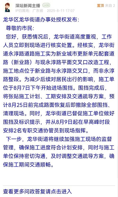 您好,獲悉情況后,龍華街道高度重視,工作人員立即到現(xiàn)場進(jìn)行核實(shí)處置。經(jīng)核實(shí),龍華街道永淳路道路施工實(shí)為新業(yè)城市更新單元配套道路(新業(yè)路)與現(xiàn)永淳路平面交叉口改造工程,施工地點(diǎn)位于新業(yè)路與永淳路交叉口,而非永淳路整段。為減少后續(xù)對居民出行的影響,施工單位于8月7日下午開始進(jìn)場圍擋。圍擋完成后,將張貼施工計(jì)劃、工期安排及交通疏導(dǎo)方案,預(yù)計(jì)8月25日前完成路面恢復(fù)后即撤除全部圍擋、清理現(xiàn)場。同時,龍華街道已督促施工單位做好圍擋及標(biāo)識提示,并從8月9日起在早高峰時段安排2名專職交通協(xié)管員到現(xiàn)場指揮。