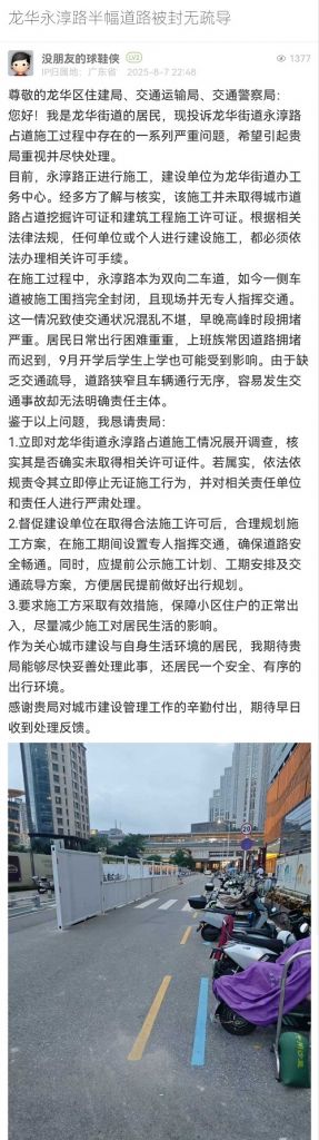 20. 帖文《龍華永淳路半幅道路被封無疏導(dǎo)》